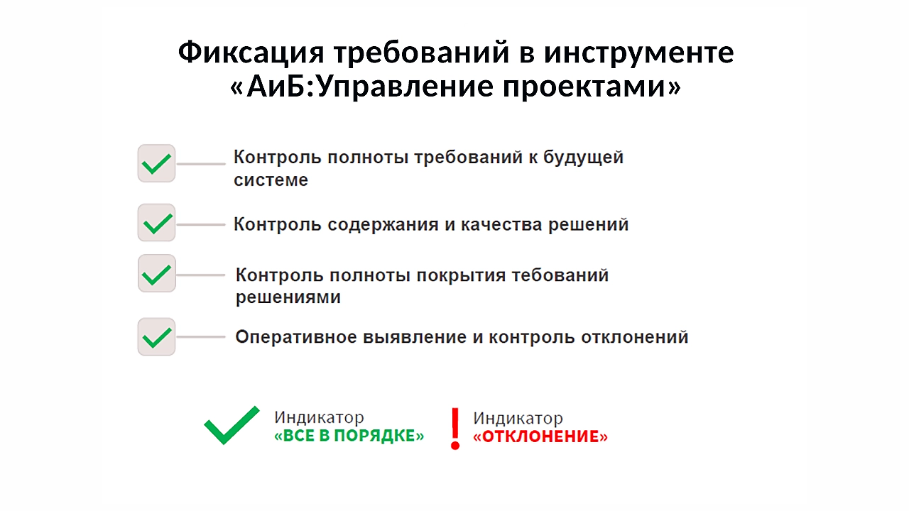 В инструменте фиксируются все требования к проекту и комментарии заказчика и исполнителя по каждому пункту. Записываются начальные требования технического задания, уточненные требования по итогам обследования, результатам функционального моделирования, итогам испытаний системы и обучения пользователей, требования, возникающие в процессе ввода в эксплуатацию. «АиБ:Управление проектами» разворачивается на сервере заказчика.