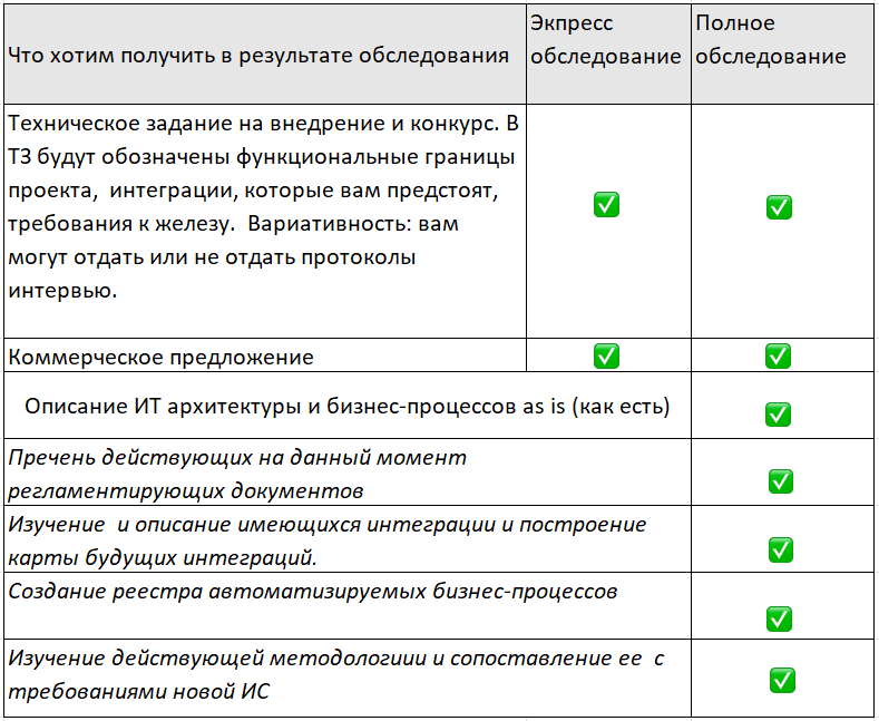 Поэтому, если планируете автоматизировать производство, мы рекомендуем делать полное обследование. Разница видна в таблице.