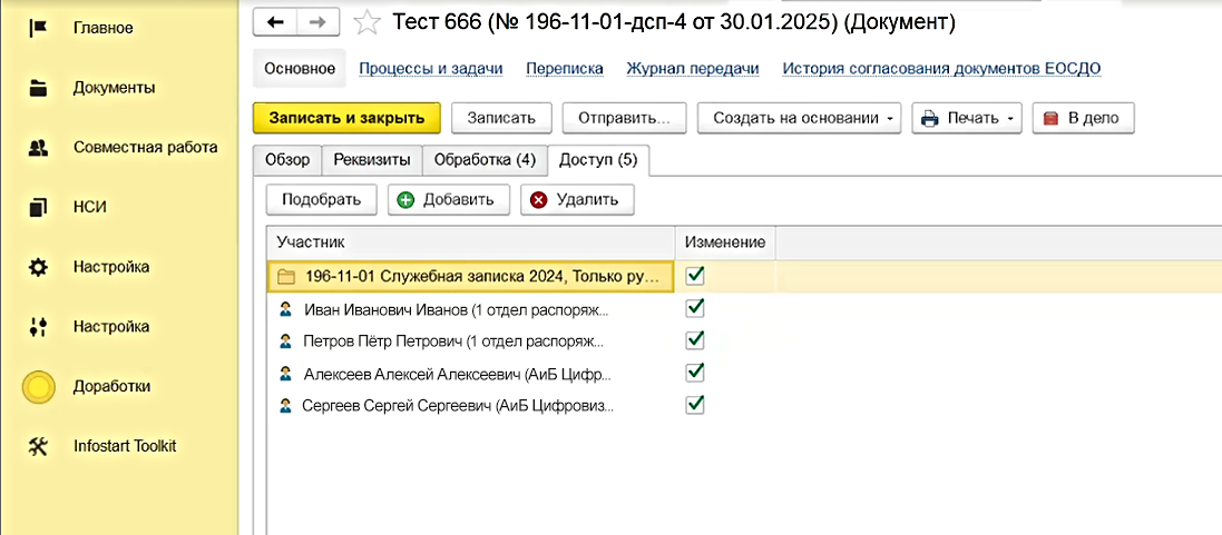 Сама система распределения доступа в «1С:ДО» устроена вполне удобно благодаря раскрывающимся спискам и системе автоподстановки. Доступность документа отражается в «Грифе доступа». Сохраняется история переписки по каждому конкретному документу.