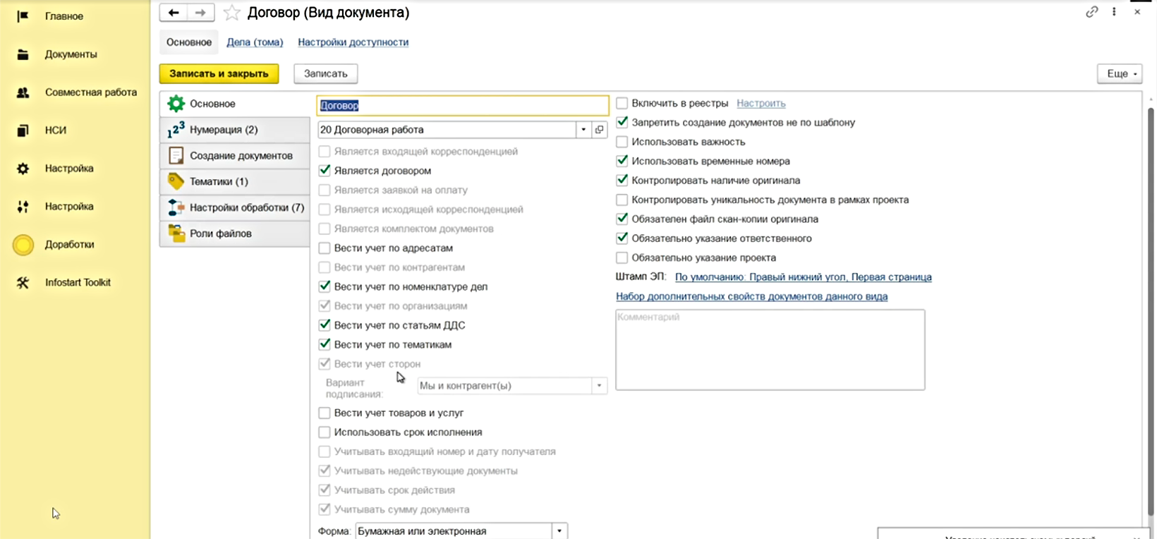 В «1С:Документооборот» предусмотрена возможность формирования сложной нумерации, в которой могут быть отражены тип договора, номер подразделения, регистрационный номер документа, тип номенклатуры и многое другое.